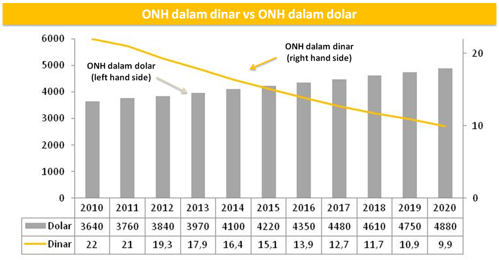 Kalau kita lihat dari penjelasan beliau, dapat diartikan bahwa ONH dalam dinar turun sangat drastis dari 97 dinar menjadi 22 dinar dalam 13 tahun.