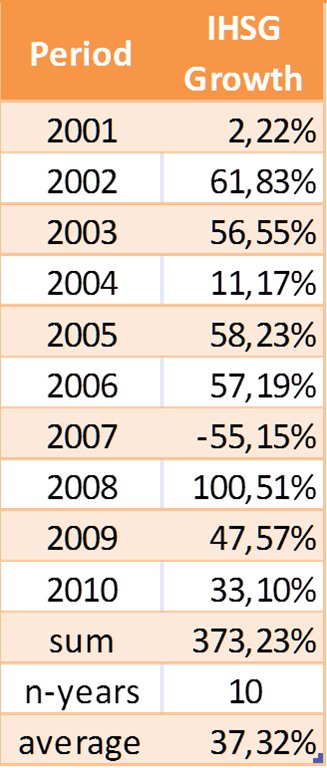 What is the fallback of this method? The computed average return on investment is bigger than the reality. If you want to test it, then try compounding the average return of IHSG by 37,32% and you’ll get a number a lot bigger than 950,39 (base year 2001 = 100).