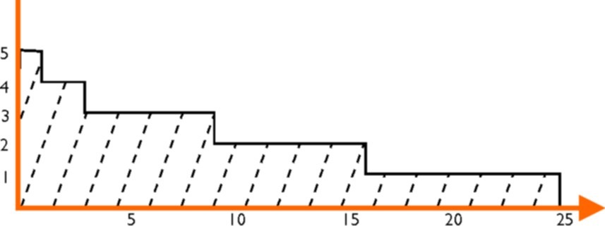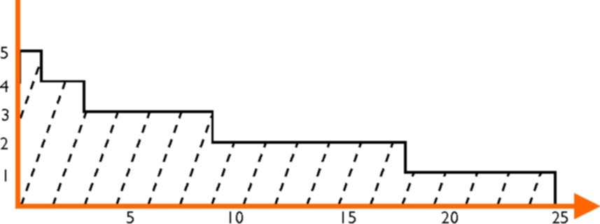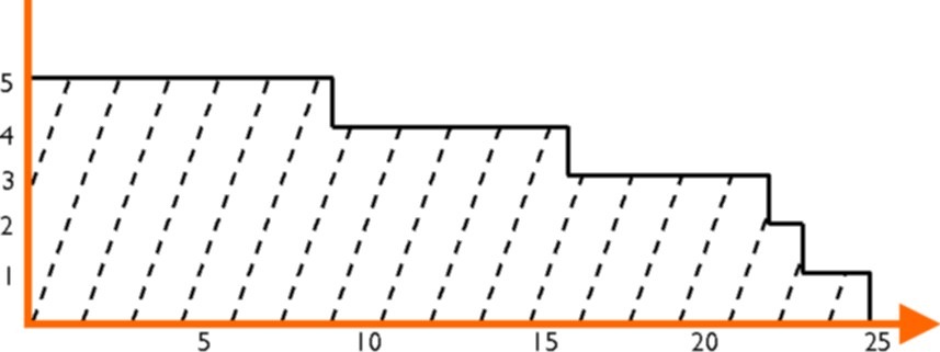 Plot waktu vs jumlah job hasil pengerjaan dengan rule first come first served adalah 54 satuan.
