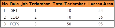 Rule tersebut diatas digunakan secara sadar oleh kita dengan tujuan untuk meminimasi jumlah job yang telat, lama waktu keterlambatan pengerjaan job dan meminimasi jumlah job yang menumpuk.