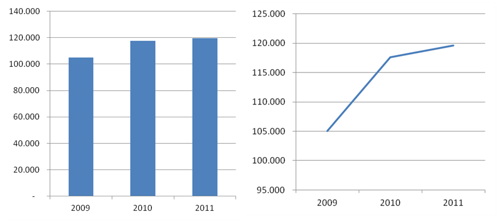 Kesalahan dalam tampilan Bar Chart ini adalah dia tidak dimulai dari angka 0 (dimulai dari 116.000) sehingga terjadi dilusi antara laba (dalam jutaan rupiah) untuk tahun 2011 dengan 2010.