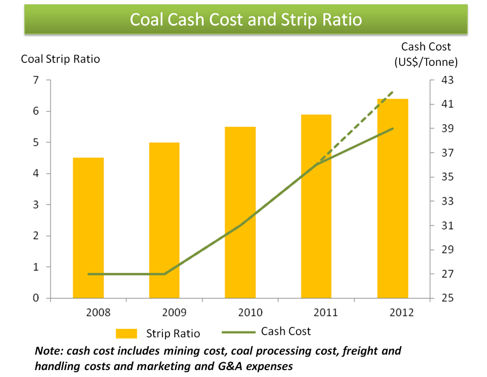 Jauh lebih gampang kan dibacanya =) Gambar ini juga mempermudah proyeksi dari grafik sebelumnya yang disebutkan bahwa perkiraan coal cash cost untuk tahun 2012 adalah antara 39-42