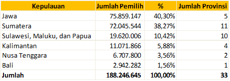Kenapa? saya merasa bahwa kewajiban menang di 50% dari total provinsi adalah bukti bahwa mereka memandang keterwakilan dari seluruh Provinsi. Berikut ini adalah jumlah pemilih presiden berdasarkan data KPU: