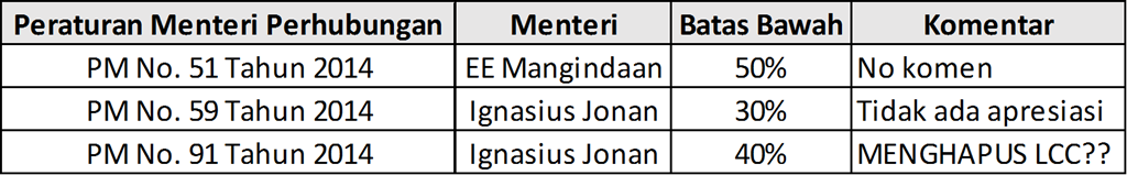 Itulah mas, mungkin susahnya itu bagi pemerintah, dalam hal ini Pak Jonan, adalah memastikan bahwa Kementeriannya memiliki kemampuan yang cukup untuk memastikan bahwa maskapai memiliki safety yang memadai berdasarkan audit kementeriannya. Dalam rangka memperbaiki kinerja internalnya tersebut, yang pastinya butuh waktu, apa iya keselamatan masyarakat mau dikorbankan? Nah itulah kenapa batas bawahnya dibatasi dengan alasan yang bermacam-macam. Saya yakin kalau nanti kementeriannya sudah cukup kapabilitasnya, tunggu deh pasti batas bawahnya direvisi lagi. Buktinya bapaknya pernah berani menurunkan ke 30%.