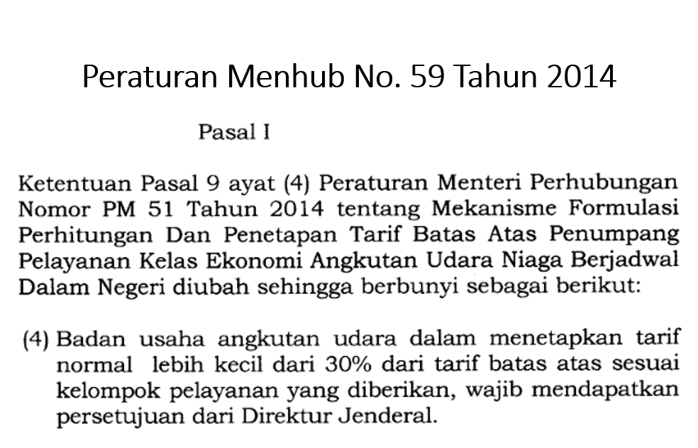 Kembali ke topik utama, adakah diantara kita yang sudah melihat kebijakan dari pak Jonan dan tidak hanya mendengar dari media? Kebijakan Pak Jonan yang menetapkan batas bawah tarif penerbangan diatur dalam Peraturan Menteri Perhubungan No. 91 Tahun 2014 tentang Perubahan Kedua Atas Peraturan Menteri Perhubungan Nomor PM 51 Tahun 2014 tentang Mekanisme Formulai Perhitungan Dan Penetapan Tarif Batas Atas Penumpang Pelayanan Kelas Ekonomi Angkutan Udara Niaga Berjadwal Dalam Negeri.