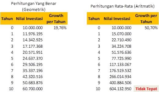 Kalau menggunakan perhitungan dari brosur tersebut, dengan pertumbuhan per tahun mencapai 50,70% selama 10 tahun, maka investasi sebesar Rp10.000.000,00 akan menjadi sebesar Rp604.132.950 di akhir periode investasi. Oleh karena itu, anda jangan mudah tergiur dengan informasi mengenai imbal hasil investasi yang disampaikan melalui penawaran investasi dari berbagai lembaga keuangan.