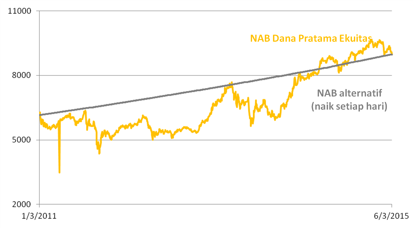Berikut adalah hasil ilustrasi kalau kita membeli produk Dana Pratama eksisting dibandingkan dengan Dana Pratama yang NAB-nya naik setiap harinya (alternatif):