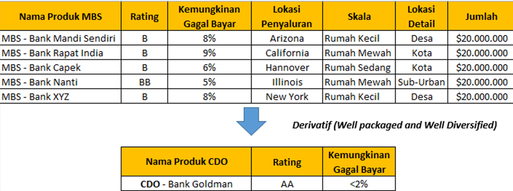 Ya, itulah bentuk CDO di sana. Contoh di atas adalah bentuk CDO dengan underlying berupa MBS yang underlyingnya adalah kredit dengan mostly rating-nya adalah B. Idenya adalah diversifikasi hal buruk yang dikemas dengan baik akan menghasilkan yang baik (later, it turned to be wrong). Bank di sana berasumsi bahwa meskipun secara rata-rata kemungkinan gagal bayar atas produk MBS tersebut adalah 5%, tapi kan tidak mungkin kredit tersebut akan macet secara bersamaan dengan parameter lokasi penyaluran, skala rumah yang dibiayai oleh kredit, dan detail lokasinya (yang bisa jadi terkait dengan sumber penghasilan penerima kredit).