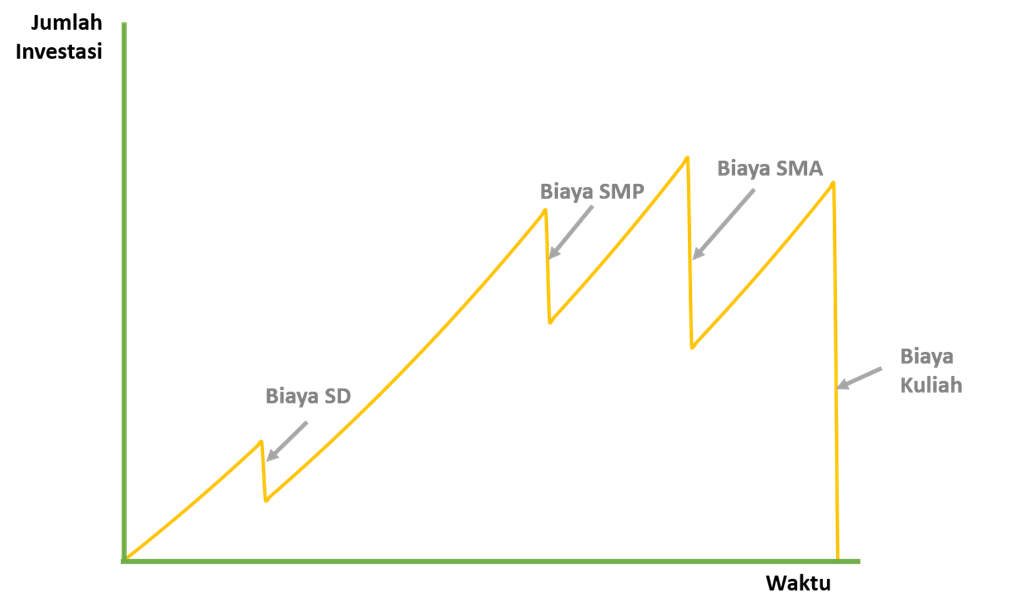 Dari grafik di atas, anda akan mengeluarkan sejumlah dana yang telah disimpan sebanyak 4 kali yaitu pada saat anak anda menginjak SD, SMP, SMA, dan kuliah. Saya mengasumsikan bahwa biaya untuk pendidikan dimulai pada saat anak masuk SD dan berakhir ketika kuliah S1.
